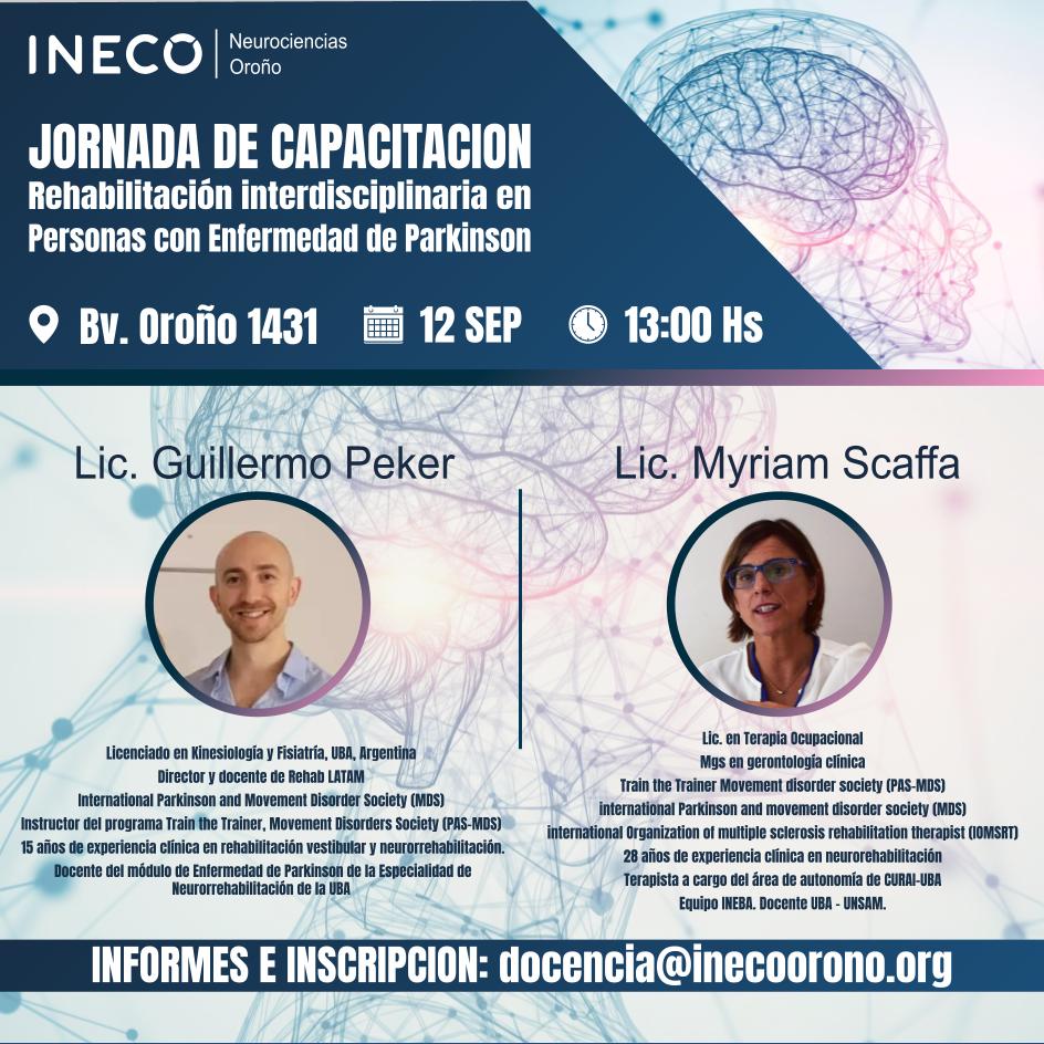 Nos complace tu interés, en la capacitación “Rehabilitación Interdisciplinaria en personas con Enfermedad de Parkinson”, que se realizará el viernes 12 de septiembre a las 13:00 hs en INECO Neurociencias Oroño (Bv. Oroño 1431, Rosario).